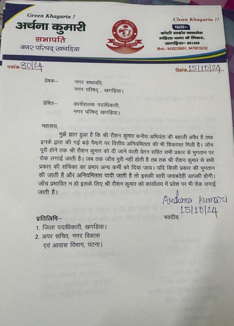पत्रकार नगर , खगड़िया नगर परिषद में अवैध तरीके से बहाल कनीय अभियंता रोशन कुमार को नगर परिषद खगड़िया का कर्मी नहीं मानते हुए नगर सभापति ने कार्यपालक पदाधिकारी नगर परिषद खगड़िया को पत्र जारी कर रोशन कुमार को दी जाने वाली वेतन सहित सभी प्रकार की सुविधाओं पर रोक लगाने का आदेश जारी किया है । नगर सभापति अर्चना कुमारी ने पत्र में कहा है कि कनीय अभियंता रोशन कुमार की बहाली फर्जी तरीके से की गई है । इसीलिए जब तक इस संबंध में जांच की सारी प्रक्रिया पूरी नहीं हो जाती तब तक उनके वेतन पर रोक लगाई जाती है और रोशन कुमार से सभी प्रकार की संचिका अन्य कर्मी को देने की बात कही गई है। यदि ऐसा नहीं किया जाता है तो सभी प्रकार के गड़बड़ी की जिम्मेवारी कार्यपालक पदाधिकारी की होगी, पत्र में ऐसा कहा गया है ।