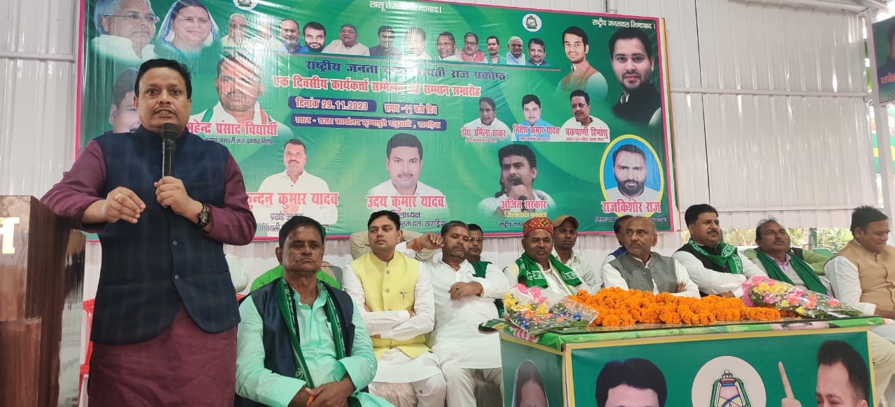राजद जिलाध्यक्ष सह बीससूत्री उपाध्यक्ष मनोहर कुमार यादव ने कहा कि सामाजिक न्याय के प्रौधा गरीबों के मसीहा लालू प्रसाद यादव ने हमेशा गरीबों के लिए काम किये हैं।लालू प्रसाद यादव मुख्यमंत्री रहते बिहार में बहुत सारे विश्वविद्यालय की स्थापना किये कि बिहार के गरीब के बच्चे भी उच्च शिक्षा प्राप्त कर ऊँचे ओहदे पर जाये। वर्तमान केंद्र में बैठी बीजेपी की सरकार नई शिक्षा नीति लागू कर रही है जिससे धीरे- धीरे सरकारी स्कूल कॉलेज को बंद कर गरीब और बहुजन को शिक्षा से वंचित करने की साजिश कर रही है। केंद्र की इस बीजेपी की सरकार में महंगाई और बेरोजगारी चरम पर है। 2014 के लोकसभा चुनाव में नरेन्द्र मोदी ने प्रत्येक वर्ष देश के दो करोड़ युवाओं को नौकरी देने का वादा किया था उनके वादा के मुताबिक अठारह करोड़ देश के अठारह करोड़ बेरोजगार युवाओं को नौकरी देनी थी लेकिन नौ साल के शासनकल में दो करोड़ भी नौकरी नहीं दिये। भारतीय रेल जो देश के युवाओं सबसे अधिक नौकरी देती है उस भारतीय रेल का निजीकरण कर रेल के कर्मचारियों को छटनी करने का काम कर रही है। केंद में बैठी मनुवादी सोच वाली आर एस एस की सरकार बाबा साहब भीमराव अंबेडकर के संविधान को नहीं मान रही है। केंद्र में बीजेपी सरकार में संविधान और लोकतंत्र दोंनो खतरा में है।आरक्षण व्यवस्था को समाप्त करने की मंशा से देश के सभी संस्थाओं को निजीकरण कर रही है। देश के बहुजन इस बात को भलीभांति समझ चुकी है इसलिए देश की जनता इसबार 2024 के लोकसभा चुनाव में इंडिया गठबंधन की सरकार बनाकर देश के लोकतंत्र और संविधान को बचाने का काम करेंगे।