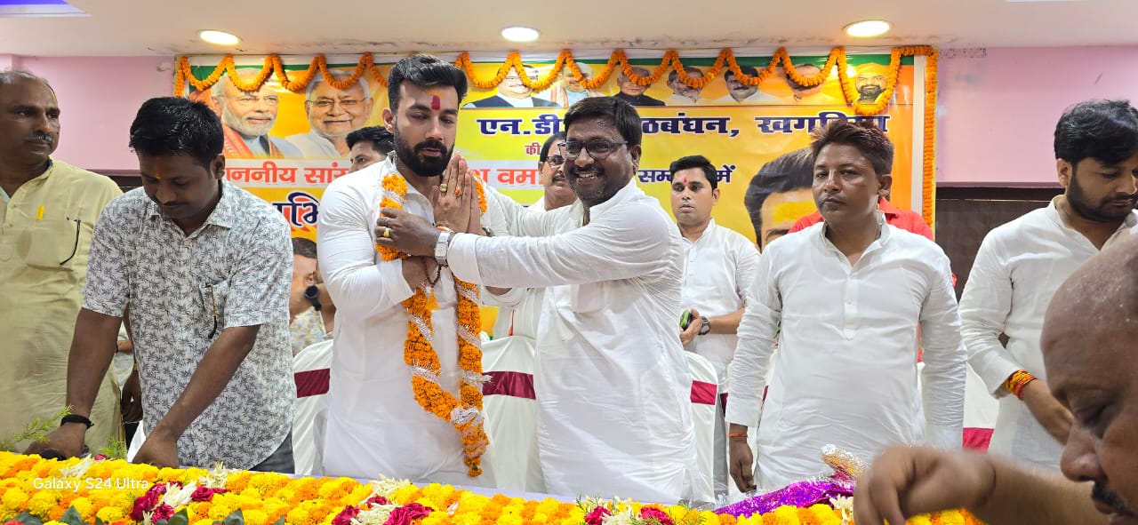 जगदूत न्यूज खगड़िया बिहार ब्यूरो चीफ प्रभु जी खगड़िया शहर के गौशाला रोड स्थित मण्डप विवाह भवन में एनडीए के कार्यकर्त्ताओं के द्वारा नव निर्वाचित सांसद राजेश वर्मा के सम्मान में भव्य स्वागत-अभिनन्दन समारोह का आयोजन किया गया।समारोह की अध्यक्षता जदयू जिला अध्यक्ष बबलू कुमार मंडल ने की।जबकि मंच संचालन लोक जन शक्ति पार्टी रामविलास के जिला अध्यक्ष शिवराज यादव ने किया।