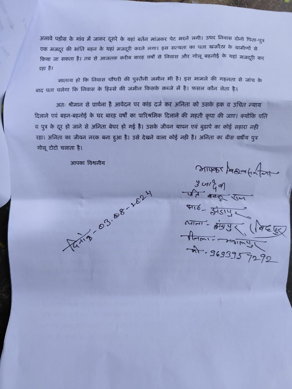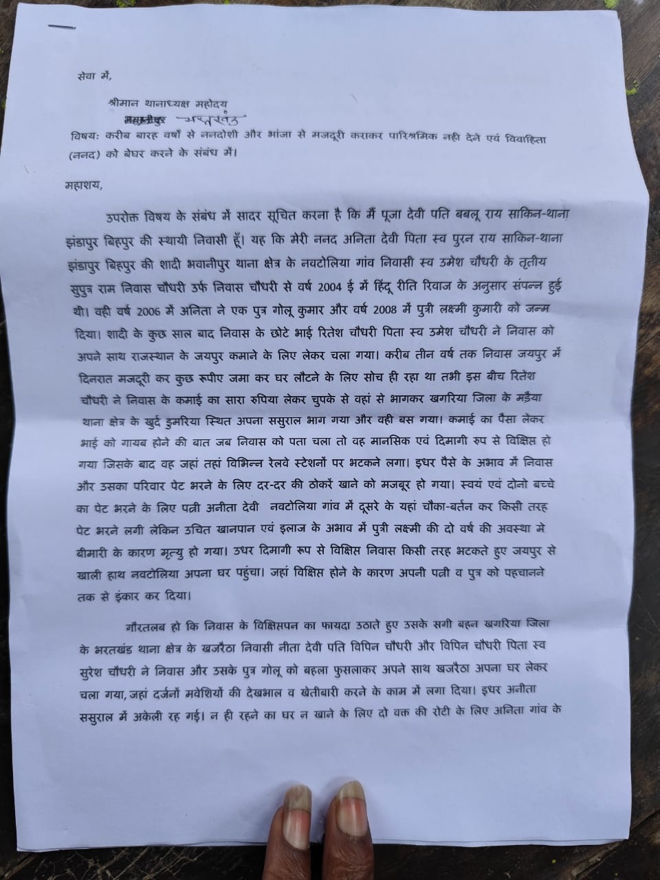 करीब बारह वर्षों से ननदोशी और भांजा से मजदूरी कराकर पारिश्रमिक नही देने एवं विवाहिता (ननद) को बेघर करने को लेकर थाना में दिया , आवेदन