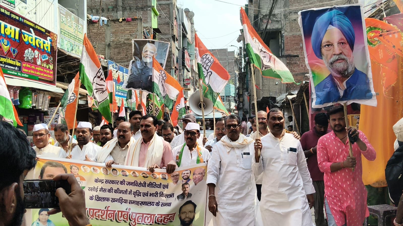 जगदूत न्यूज खगड़िया बिहार ब्यूरो चीफ प्रभु जी खगड़िया बिहार प्रदेश कांग्रेस कमिटी के आह्वान पर राज्यव्यापी कार्यक्रम के तहत केन्द्र सरकार की जनविरोधी नीतियों के कारण रसोई गैस की क़ीमतों मे वृद्धि और गैस सिलेंडर की भारी किल्लत के खिलाफ चरणबद्ध आंदोलन की कड़ी में खगड़िया जिला कांग्रेस कमिटी द्वारा जिला अध्यक्ष डॉ अविनाश कुमार अविनाश के नेतृत्व में काफ़ी संख्या में कांग्रेसजनों ने जिला कांग्रेस कार्यालय खगड़िया से विरोध प्रदर्शन करते हुए एन ए सी रोड,स्टेशन रोड,राजेन्द्र चौक से होते हुए रेलवे फ्लाइ ओवर से होकर खगड़िया समाहरणालय के सामने जोरदार विरोध प्रदर्शन किया एवं सरकार विरोध नारे लगाए एवं प्रधानमंत्री नरेन्द्र मोदी और पेट्रोलियम मंत्री हरदीप सिंह पूरी का पुतला फूंकाl उक्त मौके पर प्रदर्शन का नेतृत्व कर रहे जिला अध्यक्ष डॉ अविनाश कुमार अविनाश ने केन्द्र की मोदी सरकार पर जमकर हमला बोला उन्होंने कहा की जनता गैस के लिए सुबह से दोपहर तक लाइन में लगी है।