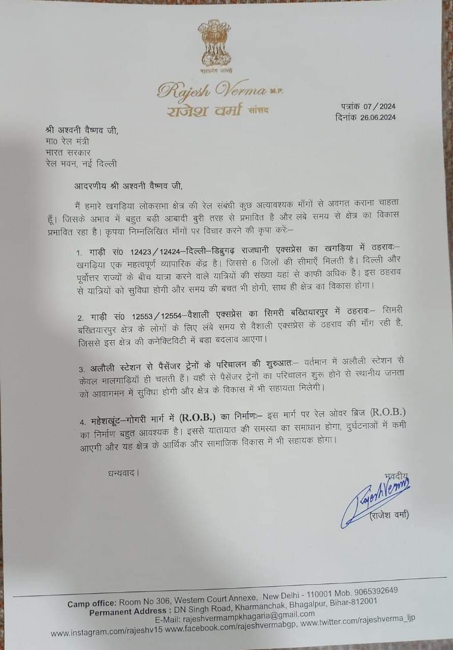 आज उन सभी मांगों के साथ सांसद राजेश वर्मा ने केंद्रीय रेल मंत्री अश्विनी वैष्णव से मिले और उन्होंने अपनी मांग पत्र सौंपते हुए उनसे खगड़िया के प्रमुख मांगों को प्राथमिकता देने का आग्रह किया। इन मांगों में से खगड़िया में राजधानी एक्सप्रेस का ठहराव, सिमरी बख्तियारपुर में वैशाली एक्सप्रेस का ठहराव, अलौली जहां से मालगाड़ियों का परिचालन हो रहा है, वहां से पैसेंजर ट्रेनों के परिचालन की शुरुआत एवं मानसी-गोगरी मार्ग में रेल ओवर ब्रिज के निर्माण की मांग शामिल है। मानसी-गोगरी मार्ग में रेल ओवर ब्रिज नहीं होने के कारण आए दिन दुर्घटना होने की खबरें आती रहती हैं, जिसको लेकर स्थानीय लोगों ने अपने नए संसद से अपनी मांग रखी थी। इन सभी मुद्दों को उन्होंने अपने मांग पत्र में शामिल करते हुए रेल मंत्री से जल्द से जल्द पूरा कराने का आग्रह किया। जिस पर रेल मंत्री अश्विनी वैष्णव ने शीघ्र आर० ओ० बी० निर्माण को लेकर संबंधित अधिकारियों को निर्देशित किया एवं अन्य मांगों पर विचार कर पहल करने को लेकर आश्वस्त किया है। इस संबंध में सांसद राजेश वर्मा से बात करने पर उन्होंने बताया कि चुनाव परिणाम के बाद वह अलग-अलग दिन अलग-अलग विधानसभा के लोगों के बीच रहे। जहां अलग-अलग विधानसभाओं में लोगों ने रेलवे से संबंधित अपनी मांगों को रखा। सबसे पहले दिन ही सिमरी बख्तियारपुर में लोगों ने बड़ी संख्या में यह मांग की थी कि वहाँ वैशाली का ठहराव कराया जाए। इससे काफी संख्या में स्थानीय लोगों को सुविधा होगी। इसके साथ ही खगड़िया में राजधानी एक्सप्रेस के ठहराव की भी मांग स्थानीय लोगों के द्वारा की गई थी। चूँकि खगड़िया 6 जिलों से घिरा हुआ क्षेत्र है इसलिए यहां राजधानी एक्सप्रेस का ठहराव उचित मांग है। यह कहीं ना कहीं व्यापारिक केंद्र भी है। यह एक तरह से कनेक्टिविटी का केंद्र भी बन सकता है क्योंकि यहां से 6 जिले आपस में जुड़े हुए हैं। अगर यहां राजधानी एक्सप्रेस का ठहराव होता है तो यहां से 6 जिले के लोगों को इसका फायदा मिलेगा। इसके साथ ही उन्होंने बताया कि जब उन्हें इस बात की जानकारी मिली कि अलौली में मालगाड़ी ट्रेनों का परिचालन हो रहा है। जबकि पैसेंजर ट्रेनों के परिचालन को लेकर अब तक वहां के स्थानीय लोगों को इंतजार है। तो उन्हें बेहद आश्चर्य हुआ। एक तरफ हम 21वीं सदी में जी रहे हैं। वहीं दूसरी तरफ खगड़िया का एक क्षेत्र ऐसा भी है। जहां लोगों को पैसेंजर ट्रेन पर सफर करने के लिए भी इंतजार करना पड़ रहा है। यही कारण है कि उन्होंने इस मांग को भी प्रमुखता से अपनी मांग पत्र में रखा। उन्होंने कहा कि माननीय मंत्री जी ने सभी मांगों को लेकर बेहद गंभीरता दिखाई है और आरओबी के निर्माण को लेकर अधिकारियों को त्वरित निर्देशित किया एवं अन्य मांगो