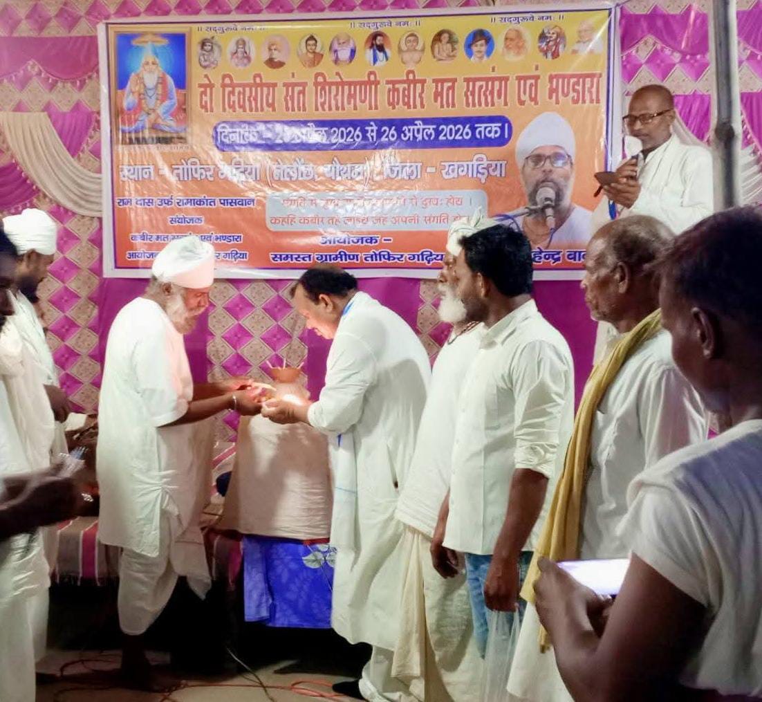 जगदूत न्यूज खगड़िया बिहार ब्यूरो चिप प्रभु जी खगड़िया, 26 अप्रैल बेलदौर विधानसभा क्षेत्र अंतर्गत तेलौछ पंचायत के तोफिर गढ़िया स्थित शिव मंदिर परिसर में दो दिवसीय कबीर मत सत्संग एवं भंडारा का श्रद्धापूर्वक भव्य आयोजन किया गया। कार्यक्रम का उद्घाटन शनिवार को देर संध्या जन कल्याण संघ एक आवाज के राष्ट्रीय प्रवक्ता सह जदयू प्रवक्ता आचार्य राकेश पासवान शास्त्री ने विधिवत दीप प्रज्वलित कर किया। कार्यक्रम की अध्यक्षता संत राम दास साहेब उर्फ रामाकांत पासवान ने की, जबकि मंच संचालन संत उपेन्द्र सिंह साहेब ने प्रभावशाली ढंग से किया। आयोजन में दूर-दराज से पहुंचे संत-महात्माओं एवं कबीर अनुयाइयों की उपस्थिति ने पूरे वातावरण को आध्यात्मिक ऊर्जा से ओत-प्रोत कर दिया।  सत्संग में पूर्णिया से पधारे संत महेंद्र बाबा ने संत कबीर के अमर वचनों को ओजपूर्ण प्रवचन और मधुर भजनों के माध्यम से प्रस्तुत किया। उनके विचारों ने उपस्थित जनसमूह को भाव-विभोर कर दिया और पूरा परिसर भक्ति रस में सराबोर हो उठा,  मुख्य अतिथि आचार्य राकेश पासवान शास्त्री ने अपने उद्घाटन संबोधन में कहा कि यह आयोजन केवल धार्मिक परंपरा का निर्वहन नहीं, बल्कि आत्म-जागरण, सामाजिक समरसता और मानवता के उत्थान का सशक्त माध्यम है। उन्होंने कहा कि संतों का आगमन किसी भी भूमि को पवित्र बना देता है और उनकी वाणी समाज को दिशा देने का कार्य करती है। जहां साधु-संतों की सेवा सम्मान नहीं होता है वहां नाकारात्मक शक्ति का प्रभाव समाज को गलत दिशा की ओर ले जाता है।उन्होंने संत कबीर के दोहों का उल्लेख करते हुए कहा कि “माला फेरत जुग भया…” आडंबर छोड़कर आत्मचिंतन का संदेश देता है, वहीं “जाति न पूछो साधु की…” सामाजिक भेदभाव के खिलाफ क्रांतिकारी विचार प्रस्तुत करता है। “ढाई आखर प्रेम का…” के माध्यम से कबीर ने प्रेम को ही सर्वोच्च ज्ञान बताया। आचार्य शास्त्री ने अपने संबोधन का महत्वपूर्ण हिस्सा युवाओं में बढ़ती नशे की प्रवृत्ति और शिक्षा पर केंद्रित करते हुए कहा कि “सुखा नशा” समाज के लिए गंभीर खतरा बनता जा रहा है, जिससे अपराध और अशिक्षा बढ़ रही है। उन्होंने समाज से आह्वान किया कि नशामुक्ति, शिक्षा और नैतिक मूल्यों को अपनाकर ही एक सभ्य, सुसंस्कृत और विकसित समाज का निर्माण संभव है।   श्री शास्त्री ने अंत में कहा कि सत्संग की वास्तविक सार्थकता तभी है जब हम संतों की शिक्षाओं को अपने जीवन में उतारकर आपसी प्रेम, भाईचारा और सामाजिक एकता को मजबूत बनायें रखेंगे।   कार्यक्रम के दौरान भंडारे का भी आयोजन किया गया, जिसमें बड़ी संख्या में साधु-संत जनों और कबीर अनुयाइयों ने महाप्रसाद ग्रहण कर आध्यात्मिक आनंद की अनुभूति प्राप्त की। आयोजन के पहले दिन की सफलत