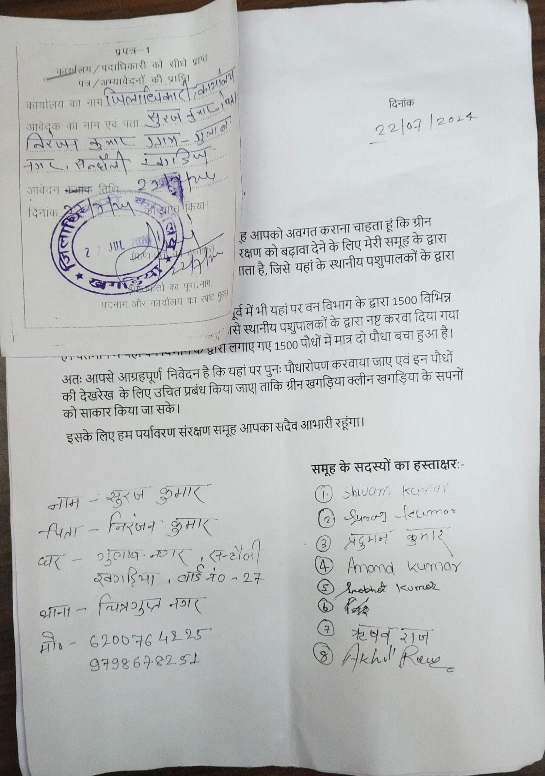 वर्तमान में यहां वन विभाग के द्वारा लगाए गए 1500 पौधों में मात्र दो पौधा बचा हुआ है। अतः आपसे आग्रहपूर्ण निवेदन है कि यहां पर पुनः पौधारोपण करवाया जाए एवं इन पौधों की देखरेख के लिए उचित प्रबंध किया जाए। ताकि ग्रीन खगड़िया क्लीन खगड़िया के सपनों को साकार किया जा सके।इसके लिए हम पर्यावरण संरक्षण समूह आपका सदैव आभारी रहूंगा। इधर jna के अनुसार डीएम को ज्ञापन देने के वाद मीडिया से कहा हमलोग पर्यावरण को बढ़ाया देने के लिए हम सभी युवा संकल्पित है। मौके पर शिभम कुमार,गौरभ कुमार, प्रदुमण कुमार,आनंद कुमार, अखिल राजू, ऋषव राज, सुरज कुमार , अखिलेश कुमार सहित कई युवा मौजुद थे।