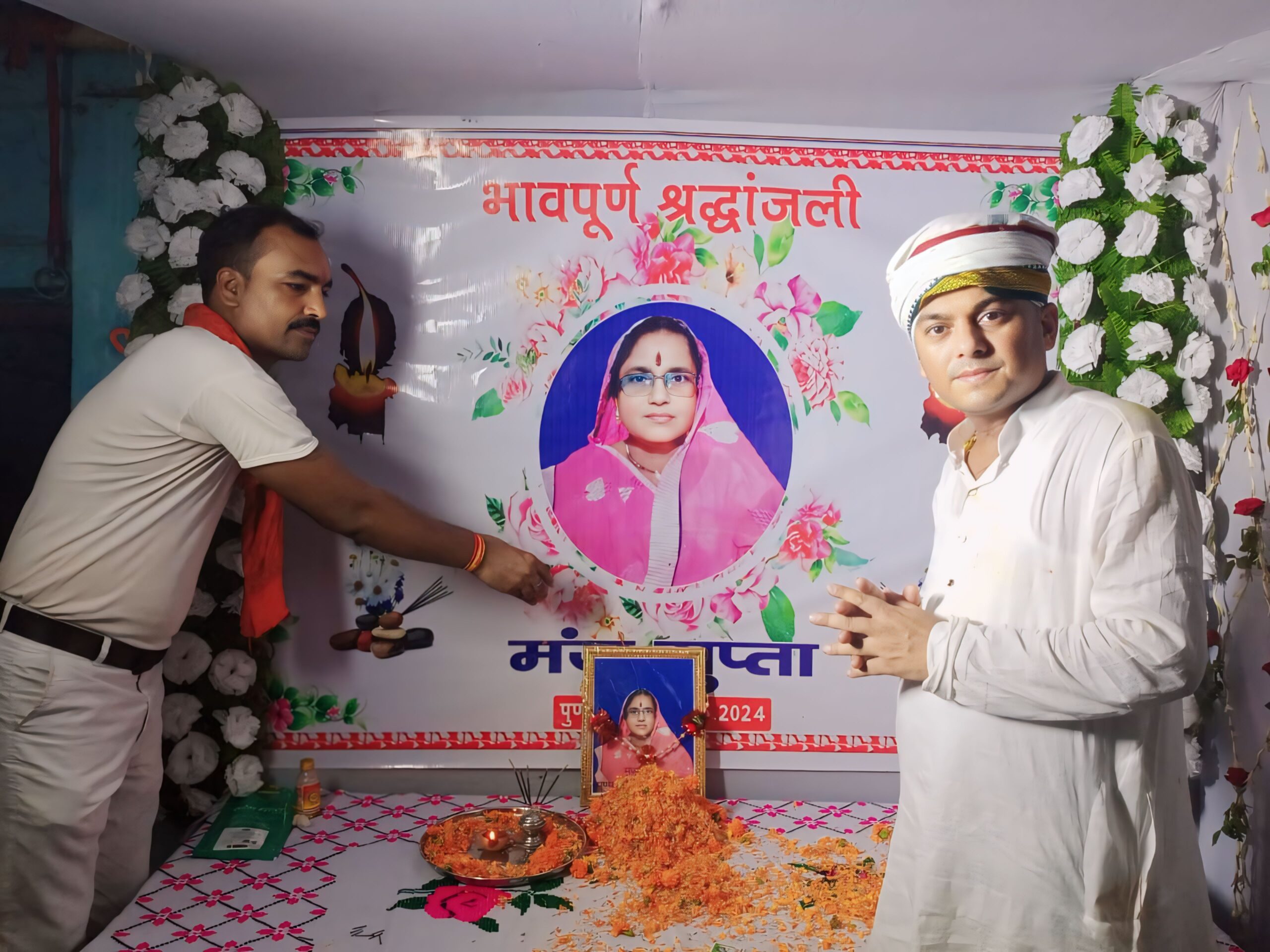 जगदूत न्यूज खगड़िया बिहार ब्यूरो चीफ प्रभु जी खगड़िया: जिले के मानसी प्रखंड के बलहा बाजार स्थित एलआईसी के विकास अधिकारी राजा कुमार एवं रूपेश कुमार की माता मंजू गुप्ता का बीते दिन इलाज के दौरान निधन हो गया था।वही मंगलवार को उसके आवास बलहा बाजार में श्रद्धांजलि सभा आयोजित किया गया। वही आपको बता दे की मंजू देवी पूर्व में हुए सरकार के द्वारा चलाई जाने वाली कई योजनाएं सर्व शिक्षा अभियान , साक्षरता अभियान बाल दीदी आदि के रूप में अपना योगदान दी थी। वह काफी सामाजिक, मिलनसार एवं मृदु भाषी महिला थी। वही मौके पर बलहा पंचायत के मुखिया राजेश भारती उर्फ पप्पु साह, सरपंच सुबोध यादव , मानसी नगर पंचायत के उप सभापति पप्पु कुमार सुमन, बलहा पंचायत समिति प्रतिनिधि मुकेश कुमार मधु , ग्राम स्वराज संघ के अध्यक्ष संतोष कुमार, भाजपा नेता गोपाल चौधरी, बलहा पंचायत के वार्ड सदस्य सह वार्ड संघ के कोषाध्यक्ष गुड्डू साह,अमर जायसवाल, पवन शाह , वरुण शाह, चंद किशोर शाह , शिव साह, गोपाल साह, रितेश भरती ,रंजीत भारती,राकेश भारती, रवि कुमार भारती, सिकेंदर वक्त आजाद, रामप्रवेश शर्मा, मनोज कुमार पटेल, प्रभु जी, सतीस कुमार रजक आदि दर्जनो  पत्रकार एवं सामाजिक कार्यकर्ताओ ने श्रद्धांजलि देते हुए उनकी आत्मा की शांति के लिए प्रार्थना की है।