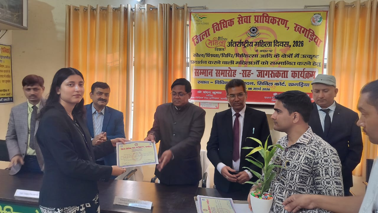 जेएनए/आर आर वर्मा पत्रकार नगर, खगड़िया।बिहार राज्य विधिक सेवा प्राधिकार पटना के निर्देशानुसार अंतर्राष्ट्रीय महिला दिवस के उपलक्ष्य में खेल, शिक्षा, विधि चिकित्सा आदि के क्षेत्र में उत्कृष्ट प्रदर्शन करने वाली महिलाओं को सम्मानित करने हेतु कार्यक्रम का आयोजन जिला विधिक सेवा प्राधिकार खगड़िया द्वारा किया गया। उक्त बात की जानकारी देते हुए प्राधिकरण के सचिव चंदन कुमार द्वारा बताया गया कि अंतरराष्ट्रीय महिला दिवस दिनांक 08 मार्च 2026 को जिला विधिक सेवा प्राधिकरण खगड़िया द्वारा खगड़िया जिला अंतर्गत खेल, शिक्षा, विधि, चिकित्सा आदि के क्षेत्र में उत्कृष्ट प्रदर्शन करने वाली महिलाओं को सम्मानित करने हेतु सम्मान समारोह-सह- जागरूकता कार्यक्रम का आयोजन किया गया। उक्त सम्मान समारोह माननीय प्रभारी प्रधान जिला एवं सत्र न्यायाधीश सह अध्यक्ष जिला विधिक सेवा प्राधिकरण, खगड़िया श्री संजय कुमार की अध्यक्षता में विधिक सेवा सदन खगड़िया में आयोजित किया गया। कार्यक्रम के दौरान खगड़िया जिले के कुल 11 महिलाओं सुश्री शिप्रा चौहान ( विधि ), डॉ शोभा रानी प्रसाद ( चिकित्सा ), श्रीमती राजो देवी ( चाइल्ड ट्रैफिकिंग), सुश्री कविता कुमारी(खेल ), श्रीमती प्रियंका कुमारी (खेल ),‌ श्रीमती चंपा राय ( विधि ), श्रीमती पूजा कुमारी ( विधि ), श्रीमती सीमा कुमारी ( विधि ), श्रीमती खुशबू कुमारी( विधि ), श्रीमती शबनम कुमारी ( विधि ), श्रीमती रंजो देवी को उत्कृष्ट प्रदर्शन करने हेतु प्रशस्ति पत्र एवं गुलदस्ता देकर श्री संजय कुमार प्रभारी प्रधान जिला एवं सत्र न्यायाधीश सह अध्यक्ष जिला विधिक सेवा प्राधिकरण खगड़िया, एडीजे श्री शैलेंद्र कुमार-2, विशेष न्यायाधीश उत्पाद प्रथम श्री पुष्पम कुमार झा, विशेष न्यायाधीश उत्पाद द्वितीय श्री प्रभाकर झा द्वारा महिलाओं को सम्मानित किया गया । प्राधिकरण के सचिव चंदन कुमार द्वारा सम्मानित होने वाले सभी महिलाओं को भविष्य में आगे बढ़ने और अपने राज्य एवं देश का नाम रौशन करने की शुभकामनाएं दी और कहा कि प्राधिकरण हमेशा उनकी मदद करने हेतु सदैव तत्पर है। सम्मानित होने वाले सभी महिलाएं अत्यंत खुश और आत्मविश्वास से परिपूर्ण नजर आ रहे थी।उक्त कार्यक्रम में मुंसिफ गोगरी श्री सारिक हैदर, न्यायिक मजिस्ट्रेट श्री शशांक कुमार, श्री सौरभ कुमार, सिविल जज श्री संकल्प राज एवं सुश्री शिप्रा चौहान, भारत स्काउट और गाइड के जिला संगठन आयुक्त श्री इंद्रदेव कुमार, सामाजिक कार्यकर्ता संजीव डोम, प्राधिकरण के पीएलवी, एलएडीसीएस आदि उपस्थित रहे।
