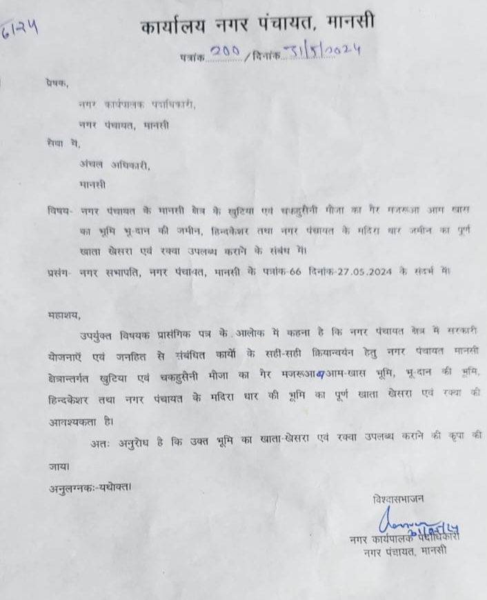 जगदूत न्यूज खगड़िया बिहार ब्यूरो चीफ प्रभु जी खगड़िया मानसी के मुख्य पार्षद प्रभा देवी ने मानसी नगर पंचायत कार्यालय के माध्यम से मानसी सीओ अमीर हुसैन से खुटिया एवं चकहुसैनी मौजा का गैर मजरुआ,गैर मजरुआ आम खास, हिन्द कैसर, भुदान, एवं मदिरा धार जमीन का पुर्ण विवरणी की मांग किया, मुख्य पार्षद प्रभा देवी ने वही मुख्य पार्षद प्रतिनिधि आयुष कुमार उर्फ गोलु सिंह ने बताया की जनहित एवं मानसी नगर पंचायत के विकास को लेकर सुची देने कि मांग किया गया। इस संबंध में मानसी सीओ अमीर हुसैन को पत्र जारी कर जमीन की विवरणी की मांग किया गया है। इधर मुख्य पार्षद प्रभा देवी ने बताया की विवरणी उपलब्ध होने पर मानसी नगर पंचायत का चहुमुखी विकास होगा।