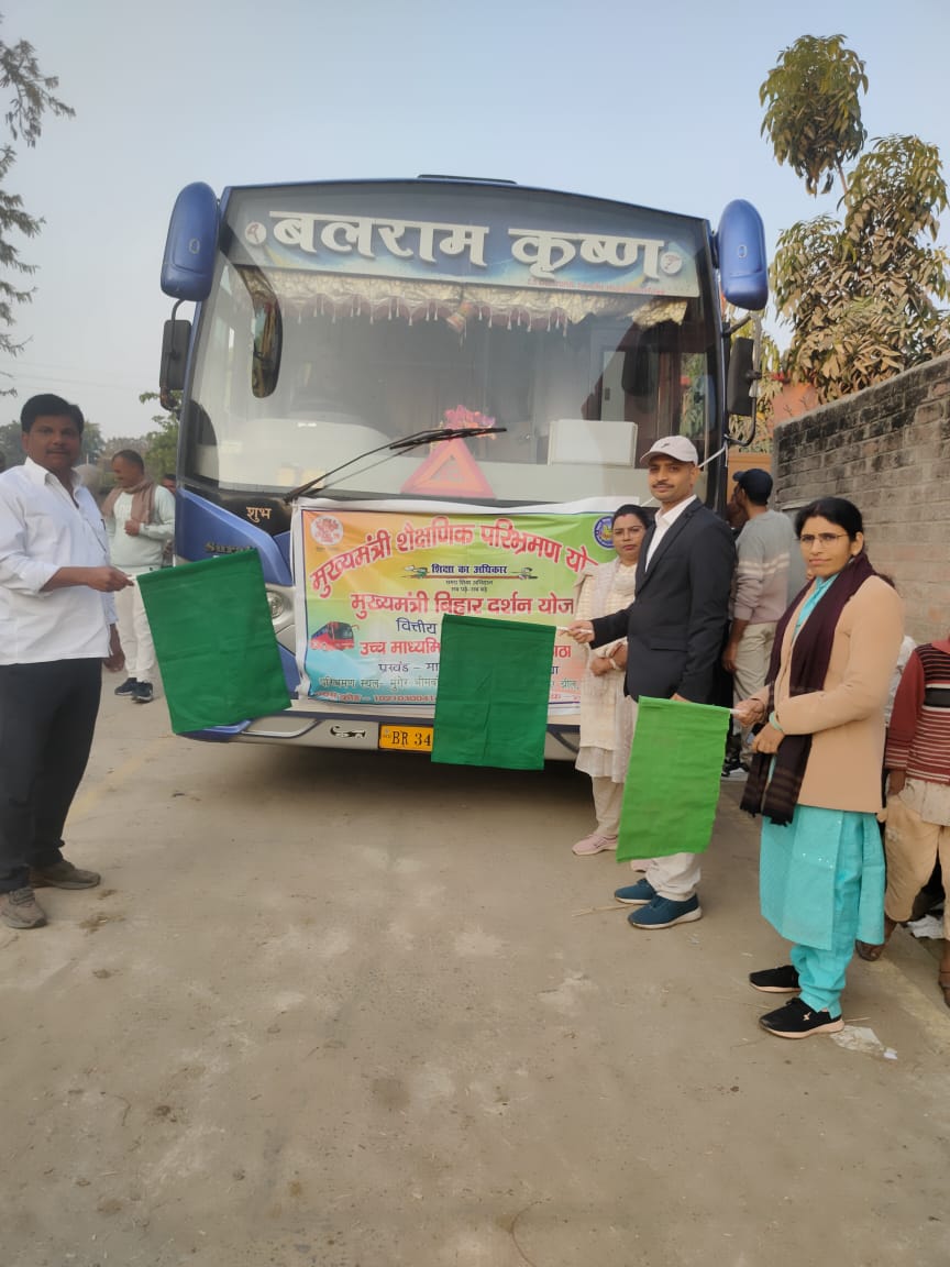 जगदूत न्यूज खगड़िया बिहार ब्यूरो चीफ प्रभु जी खगड़िया मानसी मुख्यमंत्री परिभ्रमण योजना के तहत सोमवार को उच्च माध्यमिक विद्यालय पूर्वी ठाठा, मानसी के छात्र छात्राएं एवम शिक्षक शिक्षिकाएँ, परिभ्रमण टीम को हरी झंडी दिखाकर रवाना करते मानसी प्रखंड विकास पदाधिकारी राजीव कुमार, प्रधानाध्यापक पंकज कुमार परमहंस, मुखिया प्रतिनिधि पूर्वी ठाठा श्री सुजीत कुमार एवं ग्रामीणों ने हरी झंडी दिखा कर किया रवाना, यह योजना सरकारी उच्च,मध्य विद्यालयों के बच्चों को ऐतिहासिक, धार्मिक और सांस्कृतिक स्थलों का भ्रमण कराकर उनके बौद्धिक एवं मानसिक विकास को बढ़ावा देने के उद्देश्य से चलाई जा रही है।