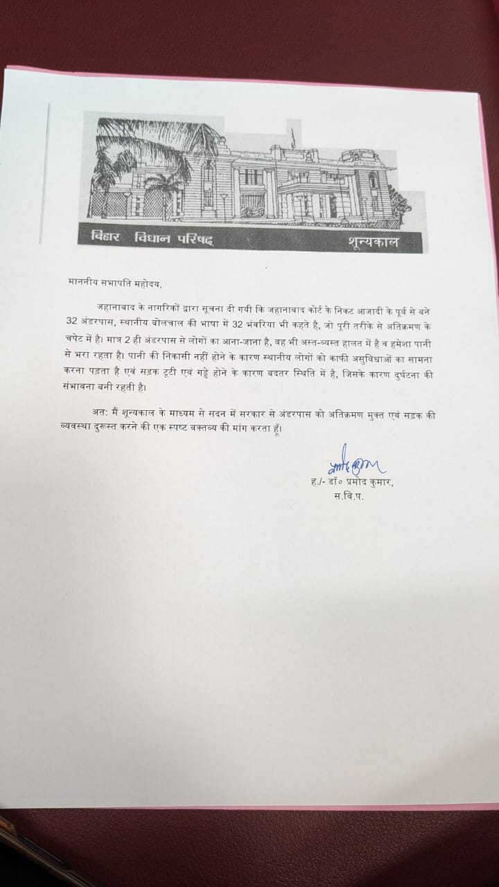 जगदूत न्यूज अनिल कुमार गुप्ता ब्यूरो प्रमुख जहानाबाद बिहार विधान परिषद सदस्य औऱ भाजपा के वरिष्ठ नेता डॉ प्रमोद कु० चंद्रवंशी ने शून्यकाल के माध्यम से सदन में जहानाबाद कोर्ट के निकट आजादी के पूर्व से बने 32 भंवरिया (अंडरपास) के अतिक्रमण का मामला सदन में गंभीरता से उठाया. डॉ चंद्रवंशी ने कहा इनमें मात्र 2 ही अंडरपास से लोगों का आना जाना है, वह भी अस्त व्यस्त हालत में है ।एवं वह भी हमेशा पानी से भरा रहता है , पानी की निकासी नही होने के कारण स्थानीय लोगों को काफी असुविधाओं का सामना करना पड़ता है. डॉ चंद्रवंशी ने कहा सड़क भी टूटी- फूटी है एवं सड़कों के बीचों- बीच बड़े- बड़े गड्ढे बने हुए हैं जिसके कारण दुर्घटना की संभावना बनी रहती है. डॉ चंद्रवंशी ने सरकार से मांग किया कि इन अंडरपास को अतिक्रमण मुक्त कराकर सुलभ एवं पक्की सड़क का निर्माण जल्द से जल्द कराया जाए।