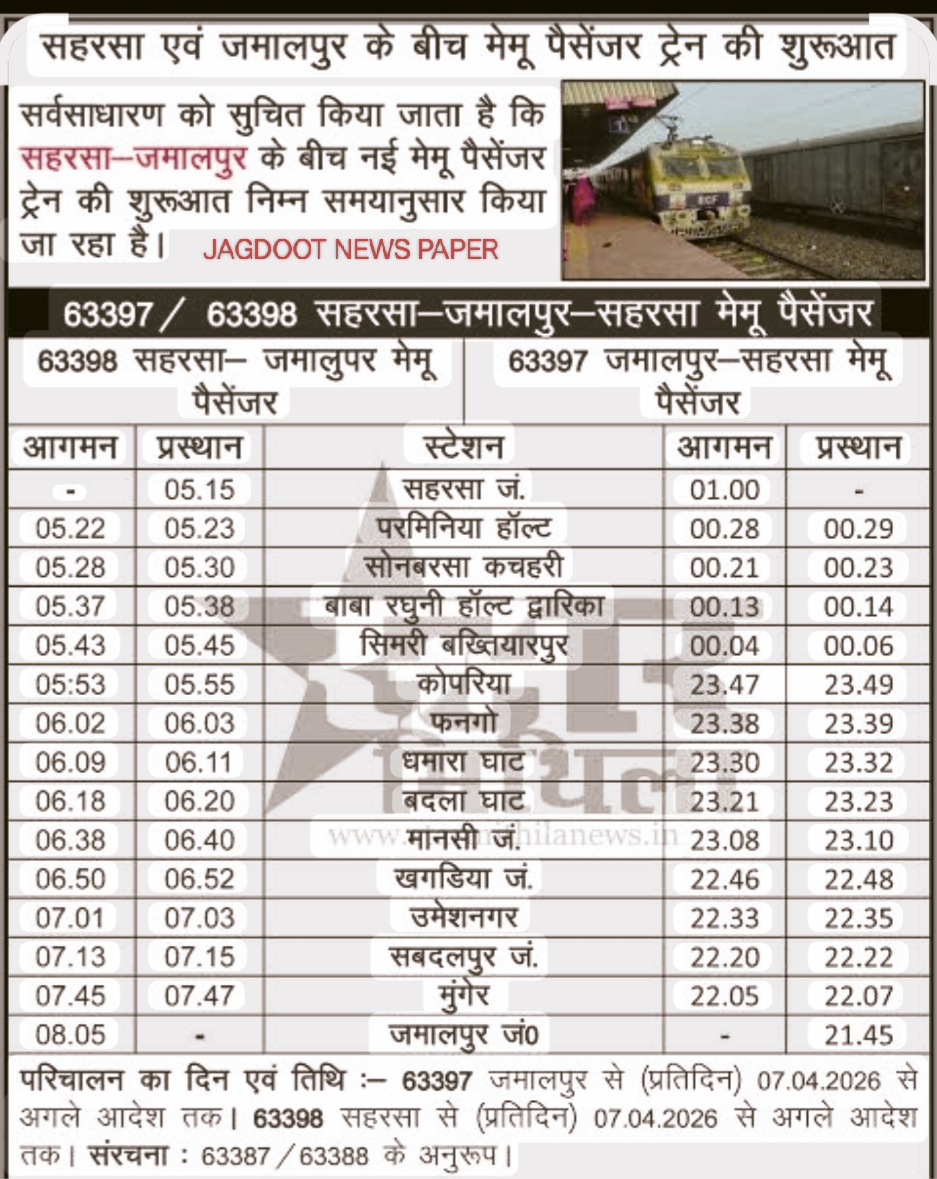 सहरसा/खगड़िया/मुंगेर । सहरसा से जमालपुर के बीच रेल यात्रियों के लिए बड़ी सुविधा शुरू होने जा रही है। 07 अप्रैल 2026 से गाड़ी संख्या 63398 सहरसा-जमालपुर मेमू पैसेंजर ट्रेन का नियमित परिचालन शुरू हो गया। यह ट्रेन सहरसा स्टेशन से सुबह 05:15 बजे खुलेगी।इससे पहले इस रूट पर स्पेशल ट्रेन का संचालन किया जा रहा था, लेकिन यात्रियों की बढ़ती संख्या को देखते हुए रेलवे ने इसे मेमू पैसेंजर ट्रेन के रूप में नियमित करने का निर्णय लिया है।जेएनए के अनुसार नई मेमू पैसेंजर सेवा का शुभारंभ स्थानीय सांसद दिनेश चंद्र यादव ने किया। मौके पर सहरसा स्टेशन पर सुबह 04:50 बजे एक छोटा समारोह आयोजित किया गया, जिसके बाद ट्रेन को रवानगी किया गया।
