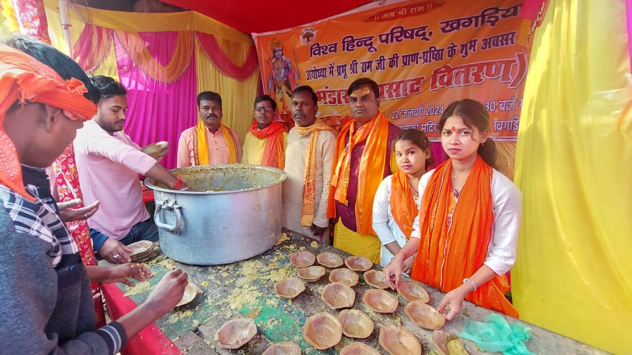 भारत वर्ष के लिए आज का दिन अत्यंत हर्ष पूर्ण और उल्लास से भरा रहा है। अयोध्या में प्राण प्रतिष्ठा के शुभ अवसर पर खगड़िया जिले में भी सभी मठ मंदिरों में धार्मिक कार्यक्रम आयोजित किए गए। प्राण प्रतिष्ठा सनातन की सहिष्णुता , संघर्ष , बलिदान और एकजुटता का प्रतीक़ है। राम आयेंगे से, राम आयें हैं तक के सफर में विहिप बजरंग दल के अनगिनत सदस्यों का बलिदान आज सफल रहा। इस बात की जानकारी देते हुए विश्व के हिन्दूओं की आवाज विश्व हिंदू परिषद् के जिलाध्यक्ष नितिन कुमार ने कहा कि आज हम सभी का जीवन सार्थक हो गया। हम सभी अत्यंत सौभाग्यशाली है कि राम मंदिर निर्माण कार्य के साक्षी बनें है। उन्होंने ने बताया कि हिंदू समाज द्वारा कहीं अखंड रामायण पाठ तो कहीं राम धुन का भजन हुआ और भंडारा (प्रसाद वितरण) का कार्यक्रम हुआ है। राम जानकी मंदिर स्टेशन परिसर में भी एक सप्ताह से चल रहा धार्मिक आयोजन हवन-यज्ञ , भंडारा के साथ सम्पन्न हुआ।