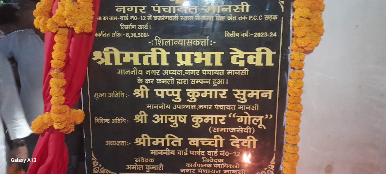 जगदूत न्यूज खगड़िया बिहार ब्यूरो चीफ प्रभु जी खगड़िया मानसी नगर पंचायत का विकास करना मेरी पहली प्राथमिकता है, प्रभा देवी सबका सहयोग सबका विकास के साथ हम कार्य कर रही हुं, उक्त बातें मानसी नगर पंचायत के मुख्य पार्षद प्रभा देवी ने मानसी नगर पंचायत के वार्ड न०-12 में सत्संग भवन के बगल में बजरंग बली मंदिर से लेकर नरेश सिंह के खेत तक बनाये गये पीसीसी सड़क के उदघाटन उपरांत कही। प्रभा देवी ने बताई की वर्षों से लोगों का चलने में कठिनाईयों का सामना करना पड़ रहा था, रोड निर्माण हो जाने से लोगों अब कठिनाईयों का सामना नहीं करना पड़ेगा। इधर मुख्य पार्षद प्रतिनिधि आयुष कुमार उर्फ गोलू सिंह ने बताया की पीसीसी सड़क 8 लाख 36 हजार पांच सौ रुपये की लागत से बनाया गया है। सड़क बन जाने से लोगों में खुशी है। गोलू ने कहा की मानसी नगर पंचायत को पांच वर्षों के अंदर हर गली मोहल्ले में सड़क का जाल बिछा दिया जायेगा। इधर वार्ड पार्षद बुच्ची देवी ने कहा की मुख्य पार्षद प्रभा देवी के नेतृत्व में मानसी नगर पंचायत में विकास का कार्य तेजी से हो रहा है। बुच्ची देवी ने कहा की हमारे वार्ड में सड़क निर्माण होने से काफी लोग मुख्य पार्षद के कार्यों को सराह रहे हैं। मौके पर संवेदक वार्ड पार्षद प्रतिनिधि सनमुन कुमार, प्रखंड जद यू अध्यक्ष राजनीति प्रसाद सिंह, नितीश कुमार, हिमांशु कुमार, देवेश कुमार, कक्कु कुमार, नवीन पासवान, शिक्षक सतीश कुमार, निरंजन पासवान, बाबू साहब यादव, सहित स्थानीय सैकड़ों लोग उपस्थित थे।